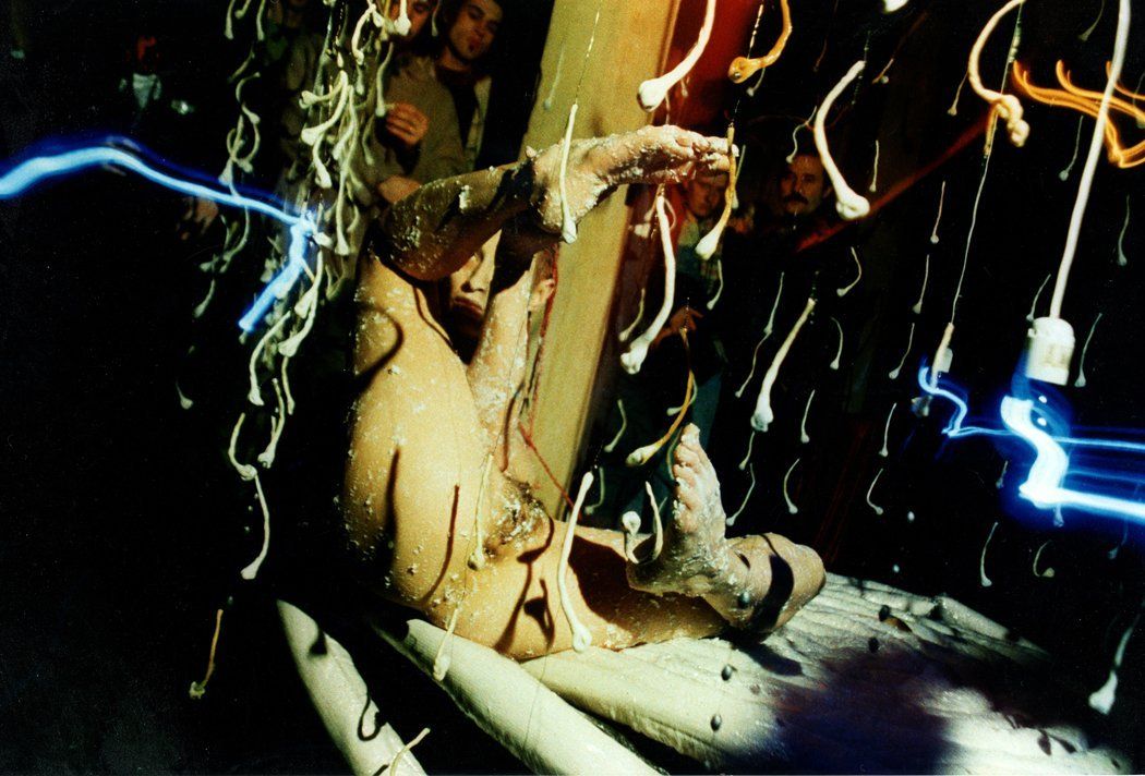 - En 1995, je monte une installation video, où je place deux caméras en vis à vis, par le viseur desquelles on peut visionner deux films en boucle ; sur l'un d'eux, je me masturbe, sur l'autre, je chie. Le public ne sachant pas ce que l'autre visionne confrontent leurs regards hébétés. C'est ce qui m’intéresse, mon travail de performer est désormais basé sur la provocation érotique ou sexuelle, je cherche à lire dans ces regards, pour y trouver les réponses aux questions que je ne connais pas encore.