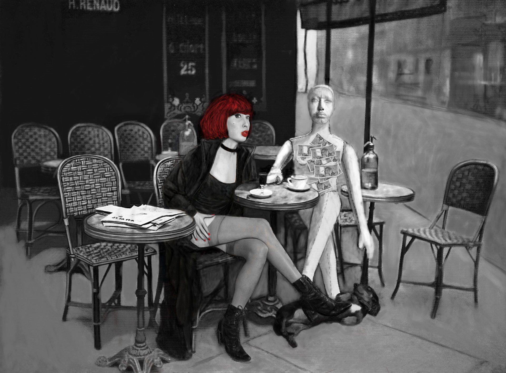 3h30, mon cerveau échappe à ce pourquoi il est programmé, il se connecte subitement à la réalité ; depuis l'opération, il refuse de se laisser prendre au jeu de la délectation perverse des rêves inconscients. Mon corps se scinde en deux au niveau du sexe, comme si mes jambes voulaient quitter mon coeur. Avant, lorsque cela m'arrivait, somnambule, je baisais, je m'empalais sur la queue de mon amant endormi, et frottais mon clitoris sur son ventre. Sa queue dans le mien, dure et immobile, son cerveau ailleurs, dans un ego trip qui maintenait l'engin toujours raide, j'étais possédée sans risque de possession. J'ai toujours préfèré les libertins, ou les apprenti-coquins, et plus encore, depuis que je ne suis plus amoureuse. Ceux là, pensais-je, à tort, n'iront jamais s'offusquer d'être objet de désir, plutôt que mari à retenir. Mais depuis que je suis ici, je n'en ai plus envie. Les amants de ce type, m'ont coûté trop d'énergie, je garde précieusement celle qui me reste pour mes enfants, et mon Art. J'essaie donc de les imaginer, et me frotte à mon matelas, impossible de jouir, sans me savoir humiliée, je renonce, ce type me dégoûte à jamais. Je sais que je ne dois pas avoir honte, ni culpabiliser, la merde dont m'ont rempli mes parents, puis ces amants, leurs erzatzs, est encore bien présente. Le seul moyen de la sortir est de vider encore et encore mon inconscient. Je dois cesser définitivement de m'en emplir, quitte à ne plus jamais baiser. Il faut que j'arrête de nourrir mon subconscient, que je pense à réévaluer ceux qui m'en redonneront l'aliment. J'ai ma petite idée, mais pas le temps. Je dois éviter ceux qui prônent la mort plus que la vie, je ne suis pas le sauveur, et encore moins la sorcière arachnide qui les arrangent bien pour se décharger de leurs horreurs, qu'ils les assument. Je me lève et dessine. Après deux années entières à bâtir le squelette idéal d'un livre autobiographique, je m'incline, il ne peut se faire en un seul tome. Le premier illustrera mon printemps, de l'enfance, aux "années Beaux Arts", juste avant le "pétage de plomb". Il sera l'annonce d'une épopée artistico féminine, l'amorce d'une bombe psycho sexuelle, l'introduction d'une histoire d'amour qui commence très mal. Le dernier "acte magique" a fonctionné, les pièces du puzzle jaillissent de ma mémoire comme des champignons après les pleurs et les rires. Je crains maintenant de ne plus avoir suffisamment de temps pour tout raconter, mais surtout pour achever. J'ai des morceaux de tout partout, à relier, et beaucoup de vide à combler dans cet énorme puzzle. Beaucoup de mes travaux de cette époque ont disparu, volés, détruits, abîmés, ou volatilisés dans le grand réseau virtuel. Je les remplacerai, d'une manière ou d'une autre. il est important que le schéma soit complet, seule la cohérence révèlera la vérité, et donc la lumière sur mon obscur passé. Je veux dédier ma vie à la vie, puisque j'ai réussi à la reconquérir, c'est pourquoi je dois me concentrer sur ma délivrance. Je n'ai plus le temps non plus de m'essayer techniquement à la peinture à l'oeuf, ou à l'huile, à la gravure, il me faudrait reprendre la technique à zéro à zéro. Le dessin numérique, la photographie sommaire, les performances improvisées, les collaborations artistiques me semblent justes, ils répondent aux paramètres temporels et financiers d'une artiste pauvre, d'une femme indécemment libre, d'une mère écartelée vive. A 5 mètres de mon lit encore humide de mes suées nocturnes, je m'attable, les ordinateurs ronronnent, et le stylet gratte fébrilement la table graphique. Les bruissements s'accordent aux sons sourds et souvent grinçants, hurlants, déments, de mes titres préférés. Je tripote mes machines, sabote mon cerveau. J'ai deux machines, l'une d'elle est connecté sur le Monde que je découvre, gràce notemment à l'affreux Facebook, dont je ne peux pas encore me passer, il me permet de connaitre ces gens qui se disent amis avec moi, il y en a encore beaucoup trop. La séance dure, jusqu'à l'épuisement. Avant de m'effondrer, je sors avec mes chiens. Dehors, il n'y a pas âme qui vive, je suis le seul rectangle jaune et lumineux de cette sombre toile urbaine. Ete 2017 Insomnie