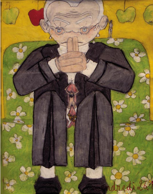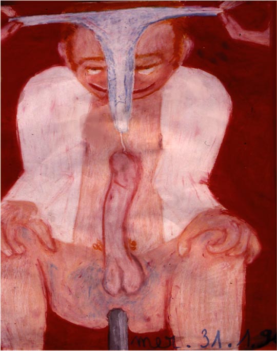 Début 1996, je suis strip teaseuse professionnelle. Lorsque je termine ma journée, je rejoins mes anciens camarades des Beaux Arts, à Rennes. J'en avais invité certains à venir au peep show, deux ou trois y sont allés, les autres n'ont pas osé. Bruno Sex portait bien son surnom, il a été le premier à venir me voir jouer, même si lui ne l'a fait qu'à moitié ; je l'aimais bien, car il assumait son voyeurisme. Il faisait figure de Daron dans notre groupe d'éphèbes, de part sa corpulence, sa pilosité brune envahissante. Quelques temps plus tôt, lorsque j'étais encore à l'école, j'avais performé pour un de ses court métrages, que je n'ai malheureusement pas. Sur une toile blanche, encadrée je crois, je dansais nue et m'exhibais avec délice. Les professeurs avaient beaucoup apprécié ma performance et m'avaient conseillée par la suite de m'engager plutôt dans cette voie, que dans la mienne. C'est vrai que j'étais très obscure dans ma représentation de la sexualité, et mes exhibitions peintes étaient clairement anti sensuelles. Mais depuis que je m'effeuillais professionnellement, j'avais retrouvé la joie, le plaisir de la provocation érotique ludique et assumée, devant des spectateurs enchantés, même si certains je l'admets repartaient décontenancés de la cabine. Il faut dire que je ne les ménageais pas avec mes performances, autant artistiques que physiques, mais je ressentais de l'empathie extrême, à tel point que je martyrisais mon sexe pour feindre le plaisir. Moi, ce qui me faisait jouir, cérébralement, c'était de découvrir leurs travers, leurs marottes, leurs secrets intimes. Je pensais ainsi pouvoir comprendre le reste du Monde. Au pastel gras, je fixe 4 spécimens de mes clients. Je me souviens avoir réalisé cette série, sous une table, à même le sol, en quelques heures. Je réservais les autres clients qui m'ont marquée par leur singularité dans ma mémoire, pour un jour, les raconter, ou les peindre, si j'en ai le temps. En 2021, je reprends ces dessins en peintures.