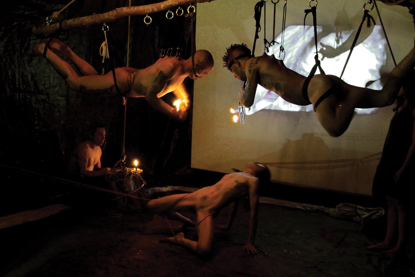 2006 Une femme et deux hommes nus ont la tête recouverte d'argile. Ils tissent une toile, sorte de cocon qui délimite leur espace. Au dessus d'eux, un méandre de nœuds où sont accrochées une vingtaine de bougies. Le fil avec lequel est bâti la chrysalide sort du sexe de la femme et de l'anus d'un des hommes. Une fois leur oeuvre achevé, les mâles se heurtent et commencent un combat entre eux. La femme allume les bougies, une pluie de cire commence à tomber sur les 3 corps. Elle se mêle à la forme chaotique. Ils forment alors un étrange monstre tricéphale. La femme attache et ligote l'un deux tandis que l'autre se flagelle ou fouette celui qui est attaché.